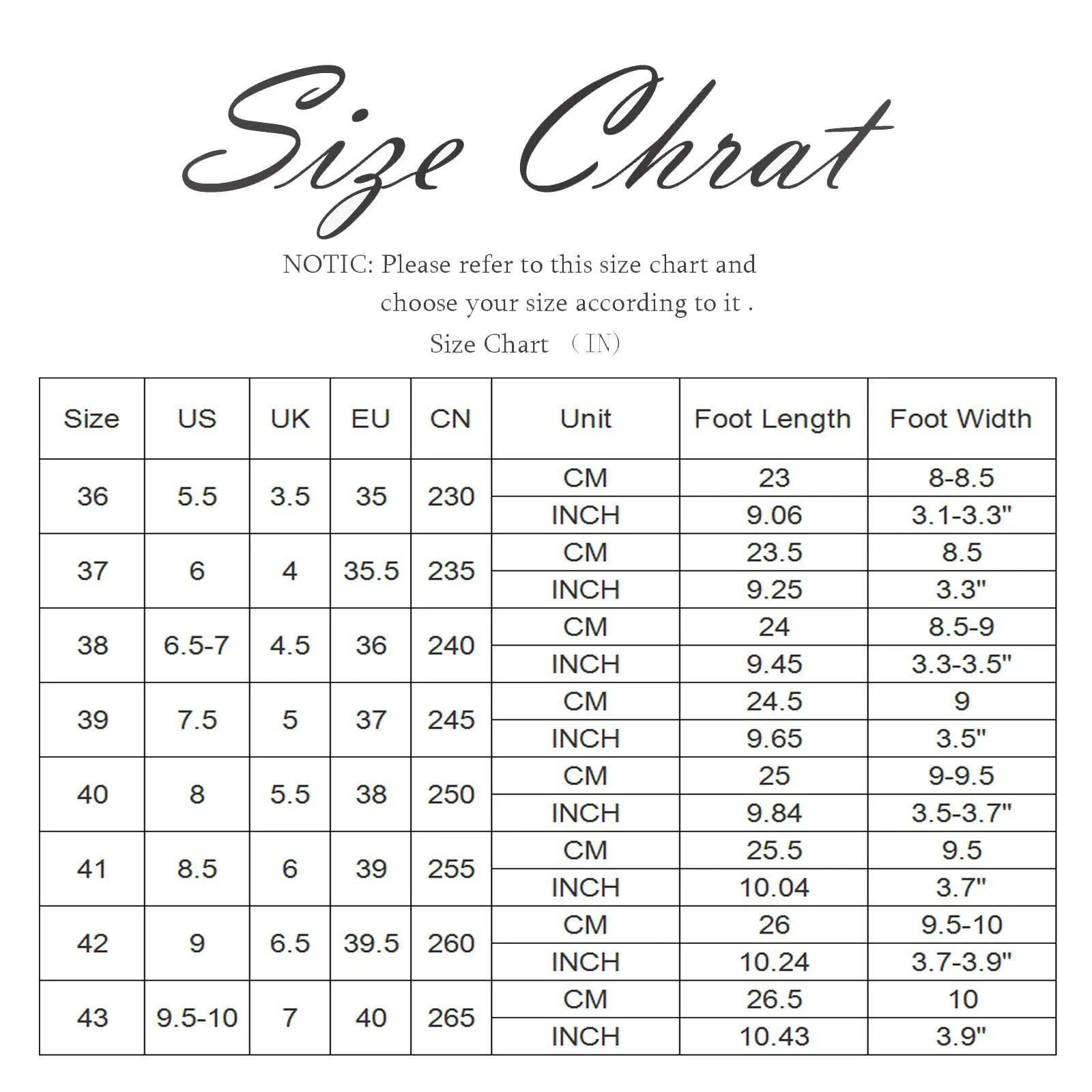 Warm Reminder:Different Shoe Styles,Please Select The Size According To Your Foot Type